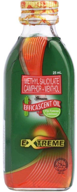 Efficascent Oil EXTREME contains: Methyl salicylate + Menthol + Eucalyptus oil + Camphor.