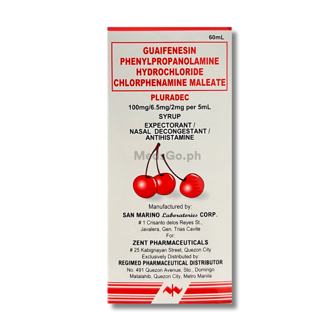 PLURADEC Syrup contains: Guaifenesin 100mg + Phenylpropanolamine HCl 6.5mg + Chlorphenamine Maleate 2mg per 5mL.