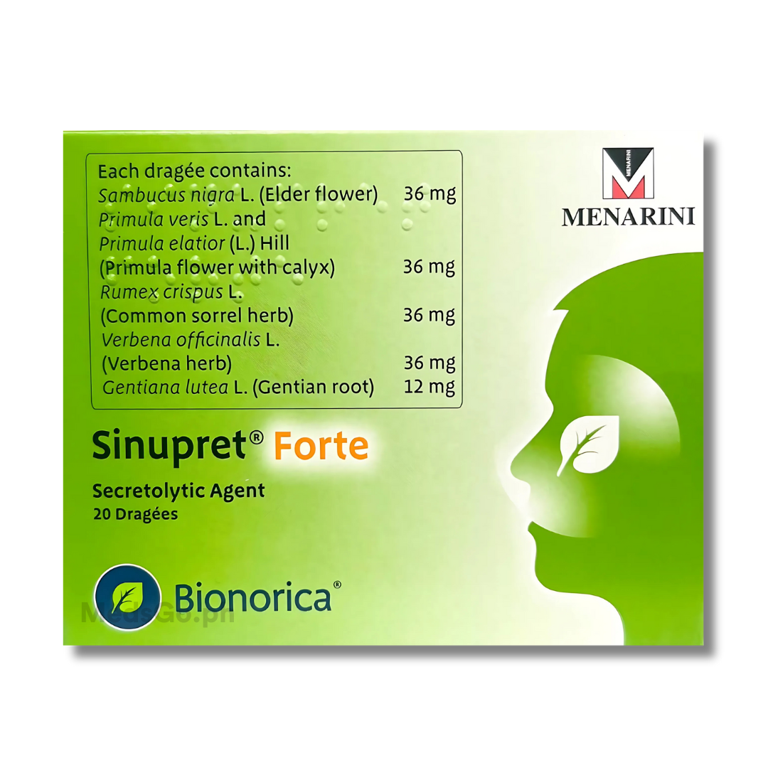 SINUPRET FORTE Dragee contains: Gentiana lutea (Gentian Root) 12mg + Primula veris/Primula elatior (Primula flower with calyx) 36mg + Rumex crispus (Common sorrel herb) 36mg + Sambucus nigra (Elder flower) 36mg + Verbena officinalis (Verbena herb) 36mg