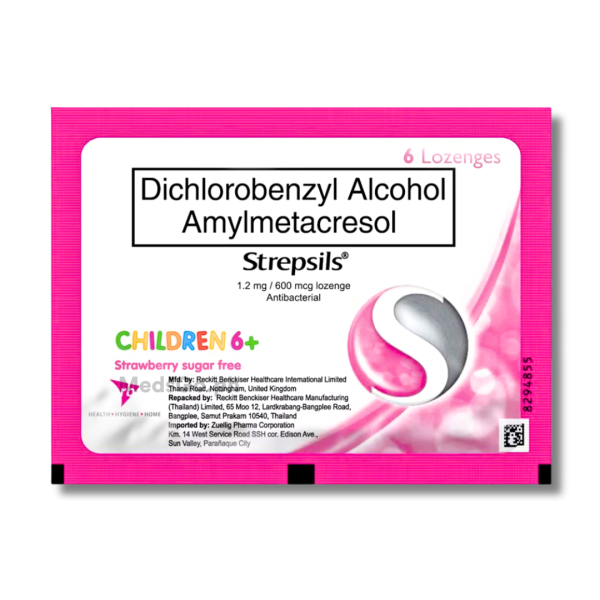 STREPSILS CHILDREN 6+ Lozenge for Kids is used for the symptomatic relief of mouth and throat infections. These strawberry-flavored lozenges contain two effective antiseptics that help soothe sore throats and reduce discomfort associated with minor mouth irritations. By targeting the bacteria and viruses that cause throat pain, it provides quick, cooling relief specifically formulated for young children who may find it difficult to swallow tablets.