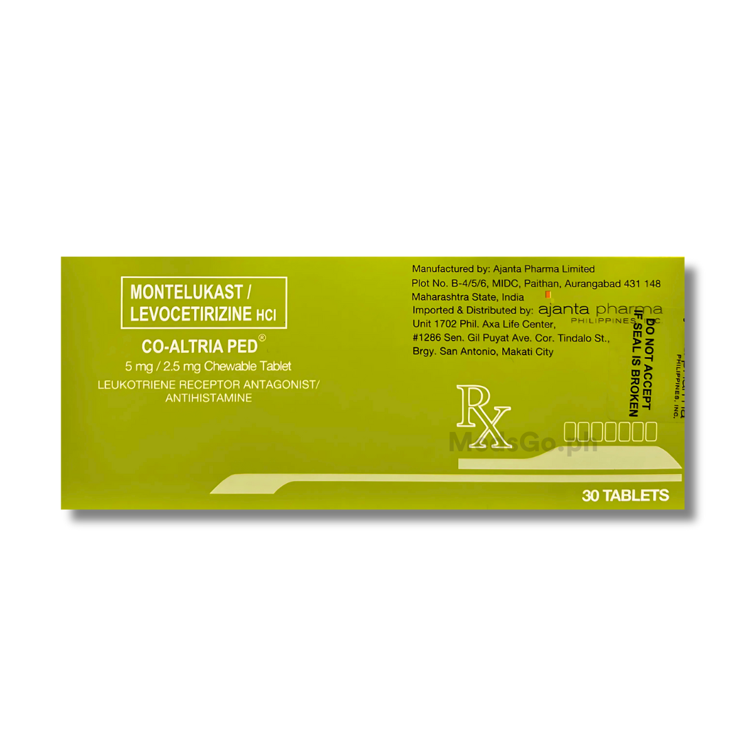 CO-ALTRIA PED Montelukast / Levocetirizine 5mg / 2.5mg common side effects include: drowsiness, fatigue, dry mouth, and headache. Some children may experience upper respiratory tract infections, fever, or abdominal pain. Behavioral changes, such as irritability or restlessness, have also been reported in some cases.