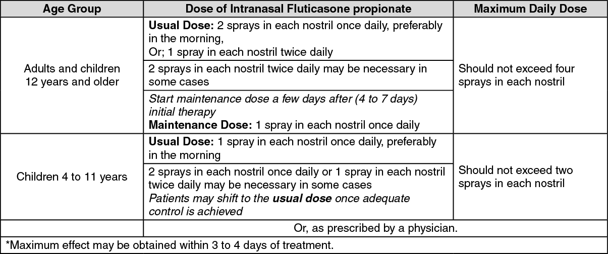 In patients with allergic rhinitis, the onset of symptomatic relief may occur within 12 to 48 hours after initiation of intranasal fluticasone propionate therapy in adults and within 36 hours in children; however, in most patients, up to 2 to 4 days are required for optimum effectiveness.