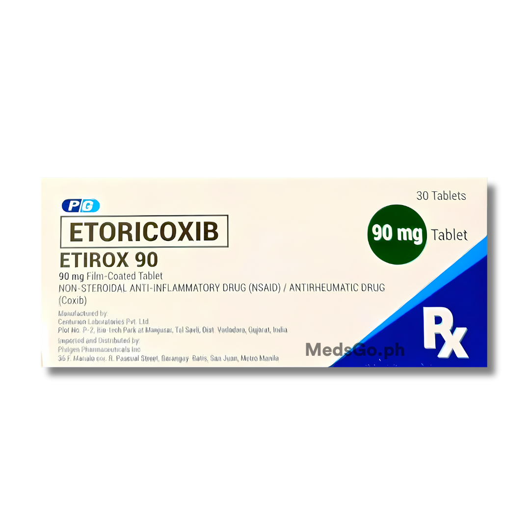 ETIROX 90 Etoricoxib 90mg is used for the symptomatic relief of pain and inflammation in adults and adolescents 16 years of age and older suffering from rheumatoid arthritis and ankylosing spondylitis. It is also indicated for the short-term treatment of moderate pain associated with dental surgery and for acute conditions like acute gouty arthritis and primary dysmenorrhea. This product helps to reduce swelling, stiffness, and discomfort in joints and muscles, offering effective relief for both acute and chronic inflammatory conditions. The use of this selective anti-inflammatory medication should be based on an assessment of individual patient risks, using the lowest effective dose for the shortest necessary duration.
