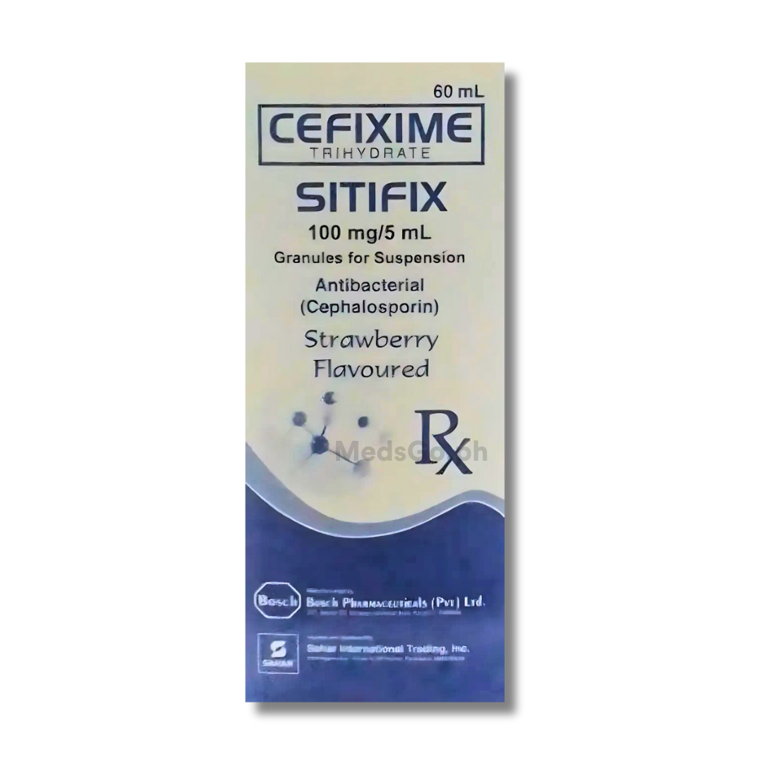 SITIFIX Cefixime 100mg / 5ml Suspension 60mL is used for the treatment of bacterial infections caused by susceptible microorganisms. It is effective against respiratory tract infections such as bronchitis, tonsillitis, and pharyngitis. This medication is also used for urinary tract infections, otitis media, and other common bacterial infections.