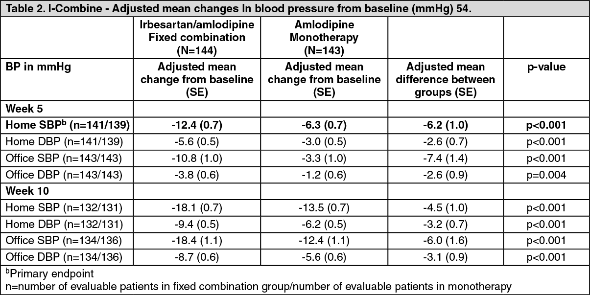 In I-ADD the primary endpoint was the change in home SBP at Week 10. In I-COMBINE the primary endpoint was the change in home SBP at Week 5. Secondary endpoints were home diastolic blood pressure (DBP) and office blood pressure measurement (OBPM) as well as the percentage of controlled patients (mean home SBP <135 mmHg) and responder patients (mean home SBP <135 mmHg and mean home DBP <85 mmHg) at Week 10 for both studies.