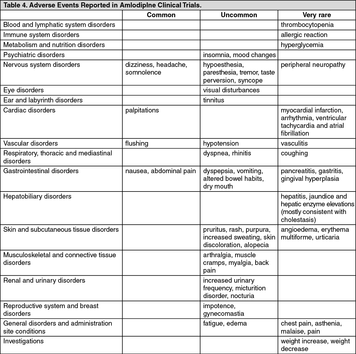 For amlodipine: Adverse events that have been reported in amlodipine trials are categorized below according to system organ class and frequency (see Table 4).