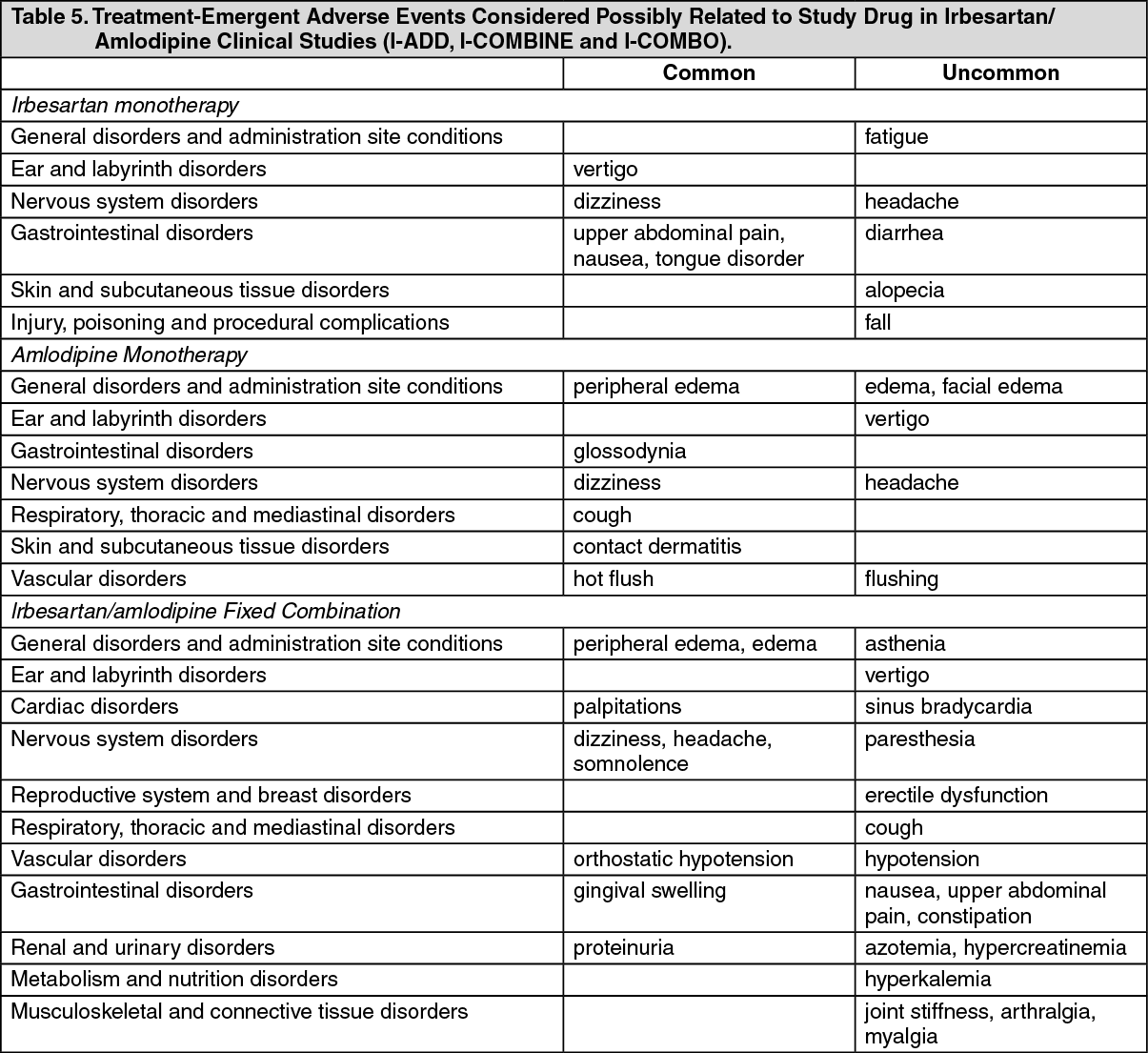 In the clinical trials comparing the fixed-dose combination irbesartan/amlodipine to either irbesartan or amlodipine monotherapy, the types and incidences of treatment-emergent adverse events (TEAEs) possibly related to study treatment were similar to those observed in the earlier monotherapy clinical trials and postmarketing reports. The most frequently reported adverse event was peripheral edema, mainly associated with amlodipine.
