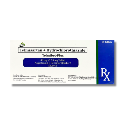 TELMIBET-PLUS Telmisartan / Hydrochlorothiazide 40 / 12.5 is used for the management of essential hypertension (high blood pressure) when pressure control is not adequately achieved with either telmisartan or hydrochlorothiazide alone. The combination of its two active components provides a synergistic blood pressure-lowering effect. Telmisartan acts by blocking a substance that causes blood vessels to narrow, while hydrochlorothiazide works as a diuretic to reduce excess body fluid. This dual mechanism helps to achieve effective blood pressure control, which is crucial for reducing the long-term risk of serious health issues.