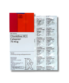 CATAPRES  Clonidine 75mcg is used for the management of high blood pressure, also known as hypertension, which includes dealing with severe elevations in blood pressure such as a hypertensive crisis. This medication works by stimulating alpha-adrenoceptors in the brainstem, which reduces sympathetic outflow from the central nervous system. This action leads to a decrease in peripheral resistance, heart rate, and overall blood pressure. Furthermore, it is also indicated for the prevention of migraine or recurrent vascular headaches and for the effective treatment of flushing and other symptoms associated with menopause.