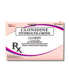 CLODIN Clonidine 75mcg is used for the management of high blood pressure, also known as hypertension, which includes dealing with severe elevations in blood pressure such as a hypertensive crisis. This medication works by stimulating alpha-adrenoceptors in the brainstem, which reduces sympathetic outflow from the central nervous system. This action leads to a decrease in peripheral resistance, heart rate, and overall blood pressure. Furthermore, it is also indicated for the prevention of migraine or recurrent vascular headaches and for the effective treatment of flushing and other symptoms associated with menopause.