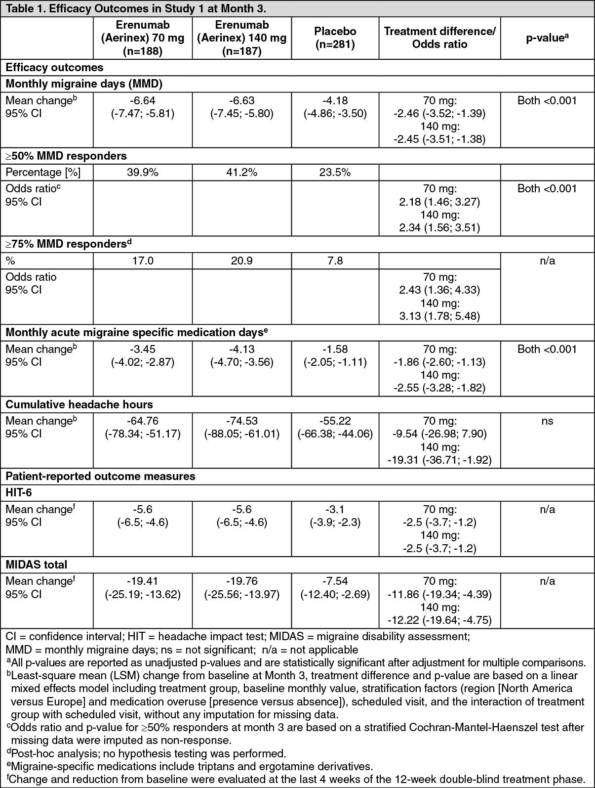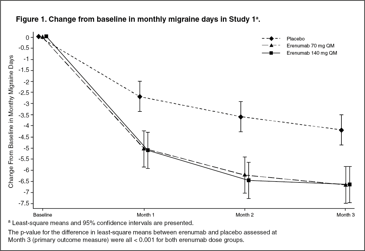The primary outcome measure was the change from baseline at Month 3 in monthly migraine days. Secondary outcome measures included the achievement of 50 to 100% reduction in monthly migraine days from baseline (≥50% responders), change from baseline in monthly acute migraine specific medication days, and change from baseline in cumulative monthly headache hours. Other than for cumulative monthly headache hours, erenumab (Aerinex) demonstrated statistically significant and clinically meaningful improvements from baseline at Month 3 compared to placebo for efficacy outcomes as summarized in Figure 1 and Table 1.