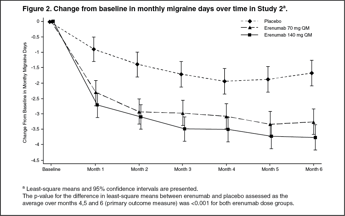 Erenumab (Aerinex) treatment demonstrated statistically significant and clinically meaningful improvements from baseline during Months 4 to 6 compared to placebo for efficacy outcomes as summarized in Figure 2 and Table 3. Differences from placebo were observed as early as Month 1.