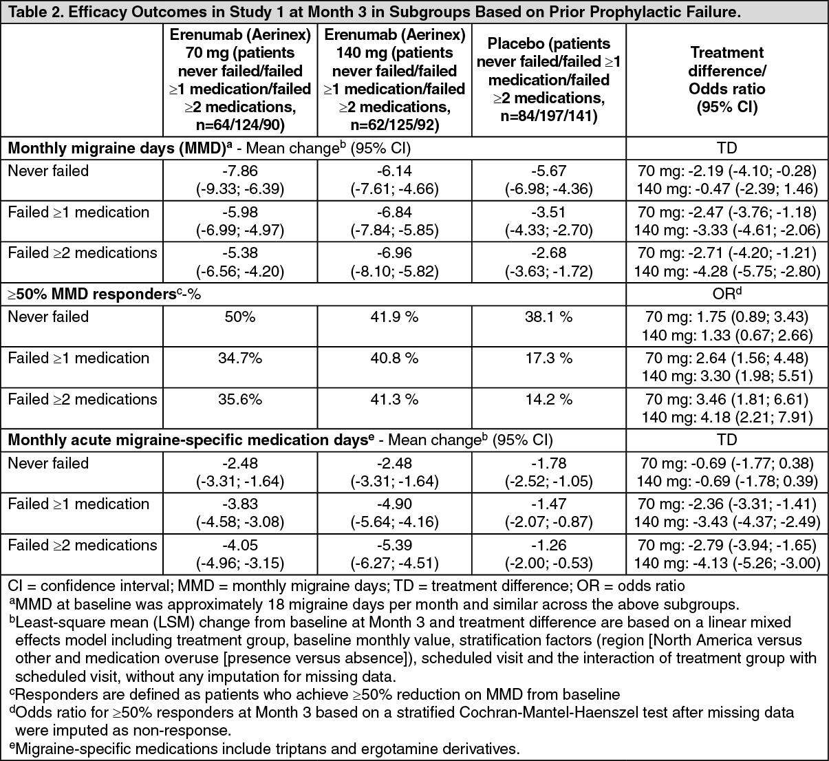 Based on a pre-specified analysis, the 70 mg and 140 mg dose of erenumab (Aerinex) were efficacious in patients who had previously been treated with migraine prophylactics. Table 2 provides subgroup results of Study 1 based on prior prophylactic failure(s) due to lack of efficacy or intolerance, in a pre-specified analysis. (See Table 2.)