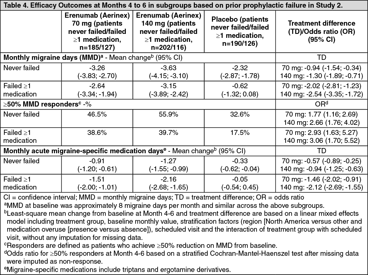 Based on a pre-specified analysis, the 70 mg and 140 mg dose of erenumab (Aerinex) were efficacious in patients who had previously been treated with migraine prophylactics. Table 4 provides subgroup results of Study 2 based on prior prophylactic failure due to lack of efficacy or intolerance, in a pre-specified analysis. (See Figure 2 and Tables 3 and 4.)