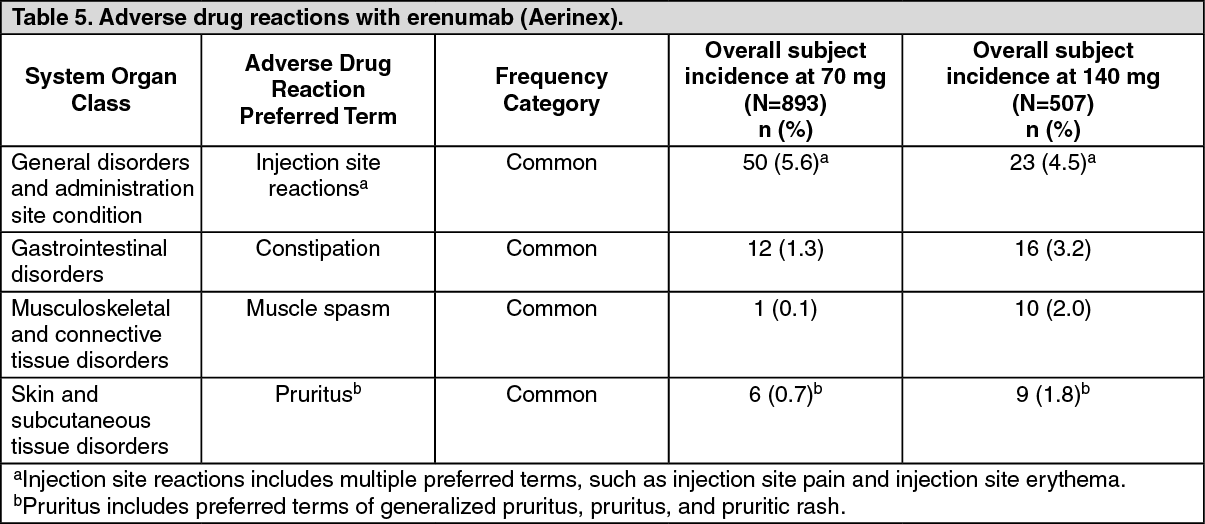 Tabulated summary of adverse drug reactions: Table 5 summarizes all adverse reactions that occurred in erenumab-treated patients during the 12-week placebo-controlled period of the pooled trials. Most of the adverse drug reactions (ADR's) were mild or moderate in severity.