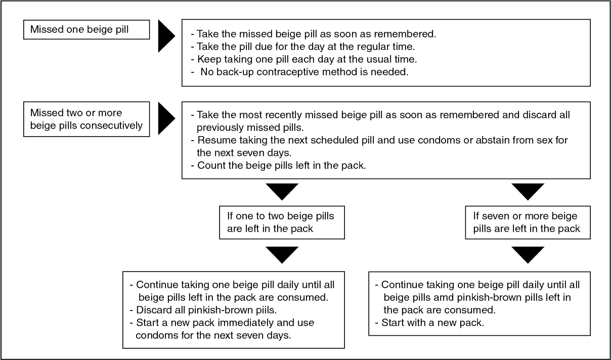 If patient missed one beige pill, it must be taken within 12 hours after the 24-hour lapse to sustain its efficacy. Take the remaining pills as scheduled to avoid premature withdrawal bleeding. Follow the instructions on Missed Pills.