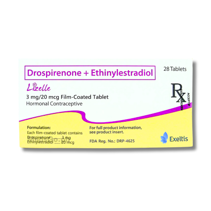 LIZELLE Drospirenone / Ethinylestradiol 3mg / 20mcg is used for the prevention of pregnancy in women who choose oral contraception as their primary method of birth control. It is also indicated for the treatment of symptoms associated with premenstrual dysphoric disorder (PMDD) and the treatment of moderate acne vulgaris in women at least 14 years of age. This low-dose combined oral contraceptive helps regulate the menstrual cycle while providing effective protection against unintended pregnancy.