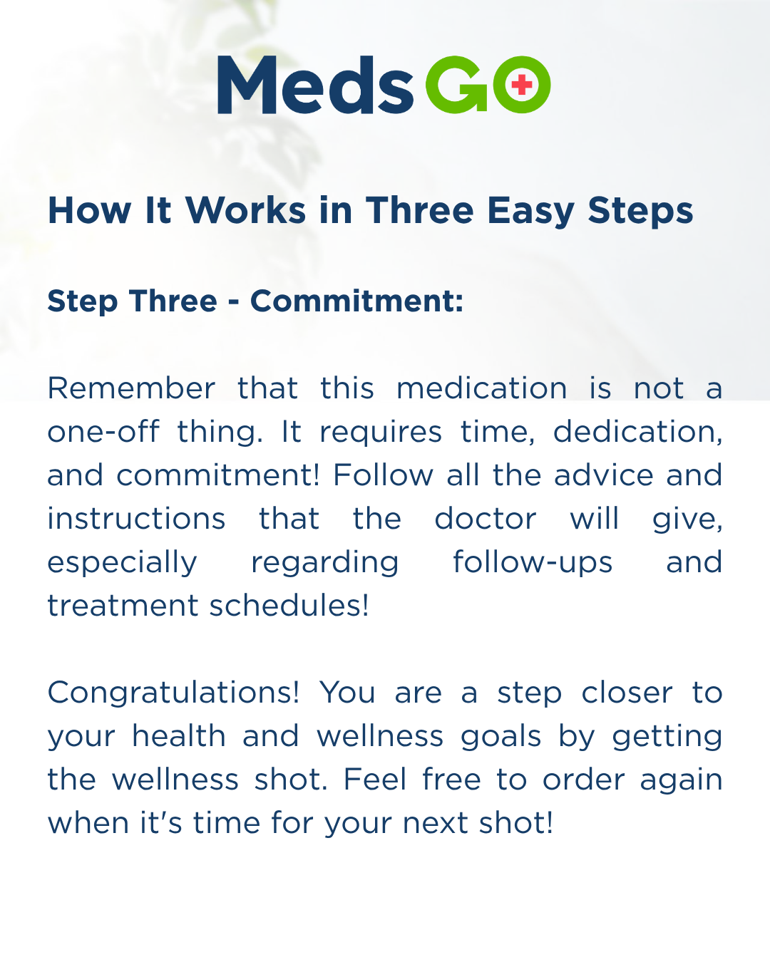 Congratulations! You are a step closer to your health and wellness goals by getting the wellness shot. Feel free to order again when it's time for your next shot!