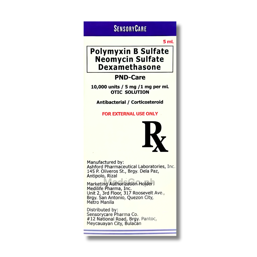 PND-CARE Polymyxin B Sulfate / Neomycin Sulfate / Dexamethasone Ear Drops contains: Polymyxin B Sulfate 10000Units/mL + Neomycin Sulfate 5mg/mL + Dexamethasone 1mg/mL
