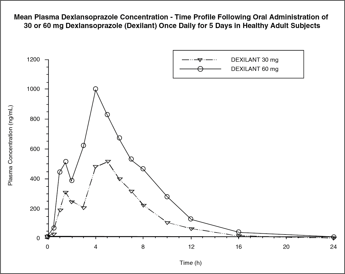 Pharmacokinetics: The dual delayed-release formulation of Dexlansoprazole (Dexilant) results in a dexlansoprazole plasma concentration-time profile with two distinct peaks; the first peak occurs one to two hours after administration, followed by a second peak within four to five hours (see figure). Dexlansoprazole is eliminated with a half-life of approximately one to two hours in healthy subjects and in patients with symptomatic GERD. No accumulation of dexlansoprazole occurs after multiple, once daily doses of Dexlansoprazole (Dexilant) 30 or 60 mg although mean AUCt and Cmax values of dexlansoprazole were slightly higher (less than 10%) on Day 5 than on Day 1. (See figure.)