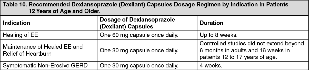 Maintenance of Healed Erosive Esophagitis and Relief of Heartburn: Dexlansoprazole (Dexilant) is indicated in patients 12 years of age and older to maintain healing of EE and relief of heartburn for up to six months in adults and 16 weeks in patients 12 to 17 years of age.