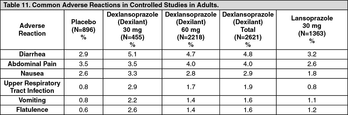 Common Adverse Reactions: The most common adverse reactions (>2%) that occurred at a higher incidence for Dexlansoprazole (Dexilant) than placebo in the controlled studies are presented in Table 11. (See Table 11.)