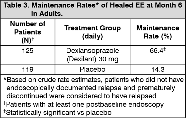 Maintenance of Healed Erosive Esophagitis and Relief of Heartburn in Adults: A multicenter, double-blind, placebo-controlled, randomized study was conducted in patients who successfully completed an EE study and showed endoscopically confirmed healed EE. Maintenance of healing and symptom resolution over a six-month period was evaluated with Dexlansoprazole (Dexilant) 30 or 60 mg once daily compared to placebo. A total of 445 patients were enrolled and ranged in age from 18 to 85 years (median age 49 years), with 52% female. Race was distributed as follows: 90% Caucasian, 5% Black and 5% Other.