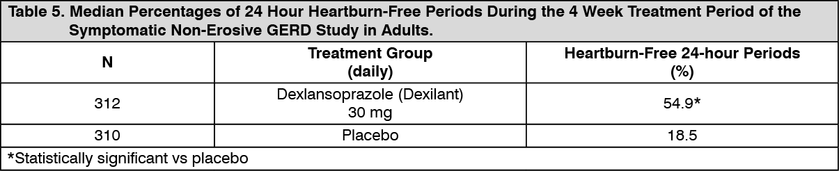 Treatment of Symptomatic Non-Erosive GERD: In a single-arm, open-label, multicenter trial, 104 pediatric patients 12 to 17 years of age with symptomatic non-erosive GERD were treated with Dexlansoprazole (Dexilant) 30 mg once daily, for four weeks to evaluate safety and effectiveness. Patients had a documented history of GERD symptoms for at least three months prior to screening, reported heartburn on at least three out of seven days during screening, and had no esophageal erosions as confirmed by endoscopy. The median age was 15 years, with females accounting for 70% of the patients. During the four-week treatment period, the median percentage of 24-hour heartburn free periods was 47%.