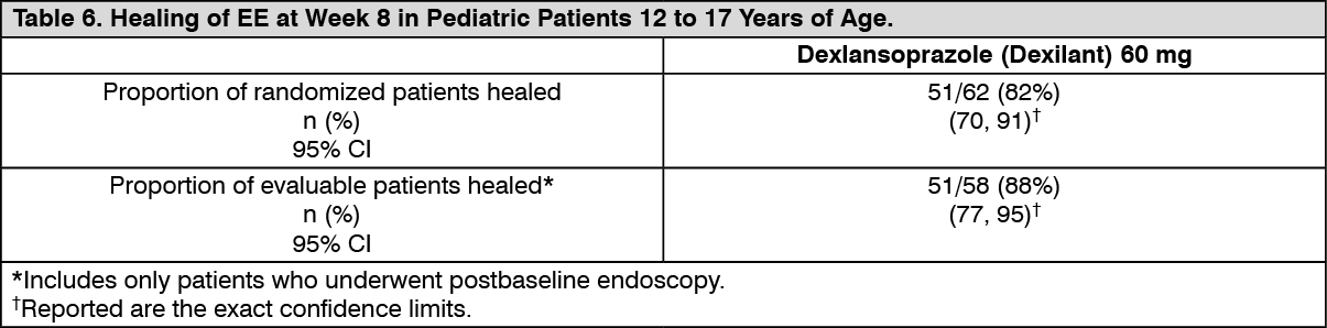 In the first eight weeks, 62 patients were treated with Dexlansoprazole (Dexilant) 60 mg once daily to evaluate the healing of EE. Of the 62 patients, 58 patients completed the eight week trial, and 51 (88%) patients achieved healing of EE, as confirmed by endoscopy, over eight weeks of treatment (see Table 6).