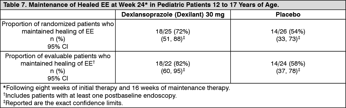 After the initial eight weeks of treatment, all 51 patients with healed EE were randomized to receive treatment with Dexlansoprazole (Dexilant) 30mg or placebo, once daily for an additional 16 weeks to evaluate maintenance of healing and symptom resolution. Maintenance of healing was assessed by endoscopy at Week 24. Of the 51 patients randomized, 13 patients discontinued early. Of these, five patients did not undergo postbaseline endoscopy. Eighteen of 22 (82%) evaluable patients treated with Dexlansoprazole (Dexilant) 30 mg remained healed over the 16-week treatment period as confirmed by endoscopy, compared with 14 of 24 (58%) in placebo (see Table 7).