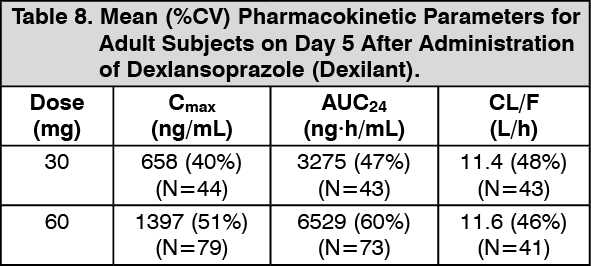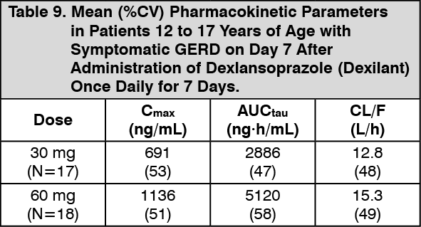 Patients 12 to 17 Years of Age: The pharmacokinetics of dexlansoprazole were studied in 36 patients 12 to 17 years of age with symptomatic GERD in a multicenter trial. Patients were randomized to receive Dexlansoprazole (Dexilant) 30 or 60 mg once daily for seven days. The dexlansoprazole mean Cmax and AUC in patients 12 to 17 years of age were 105 and 88%, respectively, compared to those observed in adults at the 30 mg dose, and were 81 and 78%, respectively, at the 60 mg dose (see Tables 8 and 9). (See Table 9.)