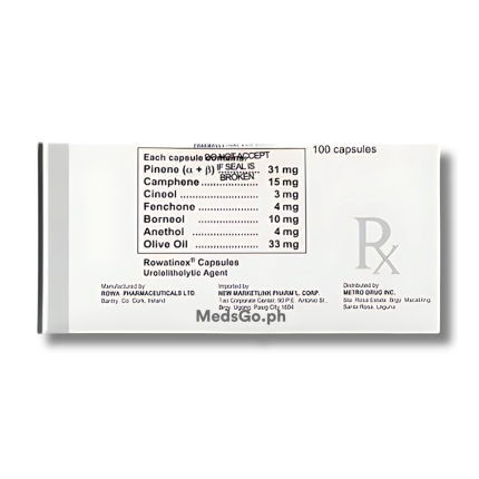 Pharmacology: Mode of Action: ROWATINEX promotes diuresis and relaxes urinary tract spasm, thus assisting the passage of stones. The therapeutic effect of the balanced combination of terpenes reduces urinary tract inflammation, stimulating renal blood flow through the kidneys and increasing the output of less concentrated urine.