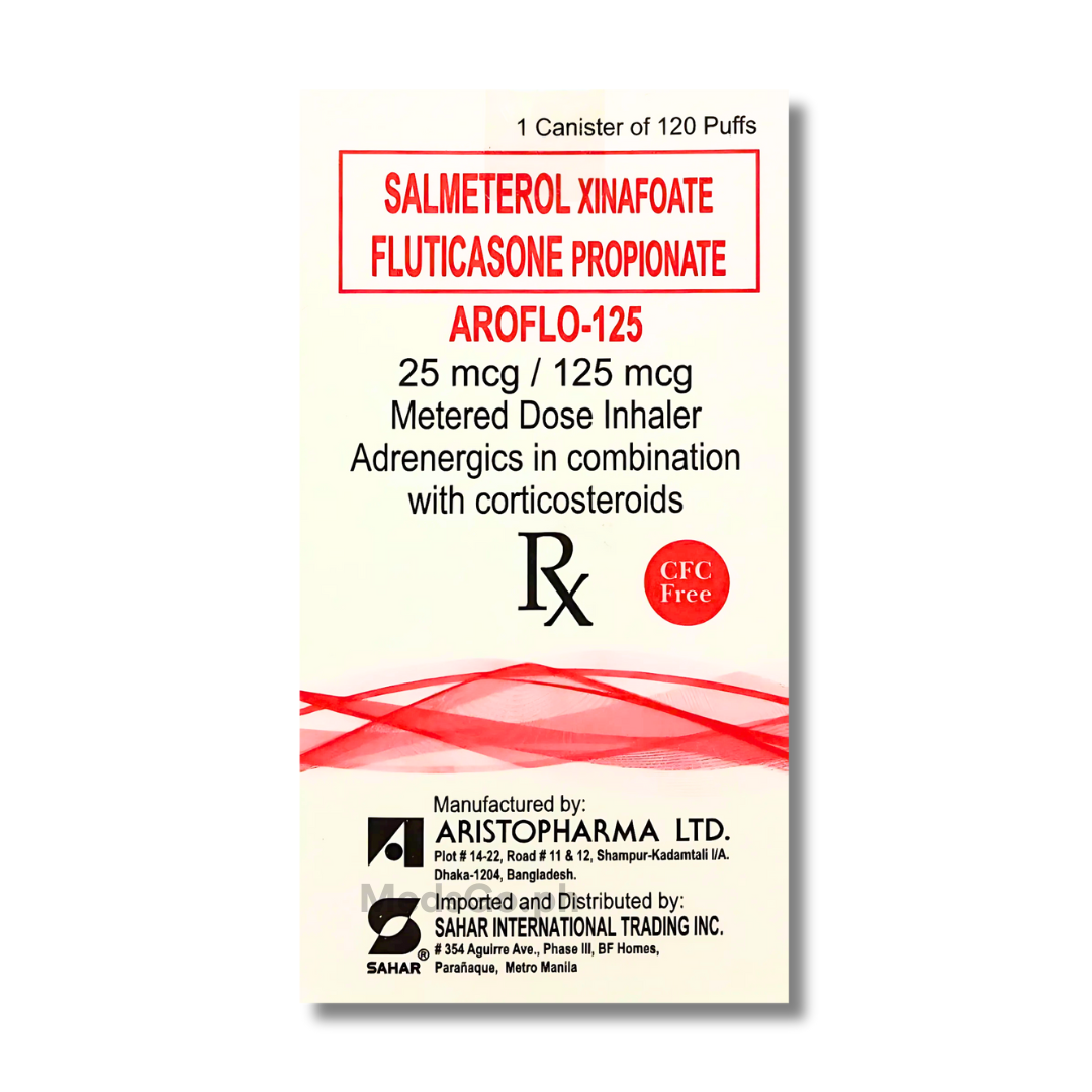 AROFLO-125 Salmeterol / Fluticasone 25 / 125 Inhaler is used for the regular treatment of asthma in adults and adolescents when a combination of a long-acting bronchodilator and an inhaled corticosteroid is necessary for disease management. It is also indicated for the symptomatic management of moderate to severe Chronic Obstructive Pulmonary Disease (COPD) to improve breathing and reduce flare-ups. The dual action of the ingredients reduces inflammation and relaxes the muscles in the airways, promoting better airflow. However, this product is intended for maintenance therapy and should not be used for immediate relief of sudden, acute breathing difficulties.