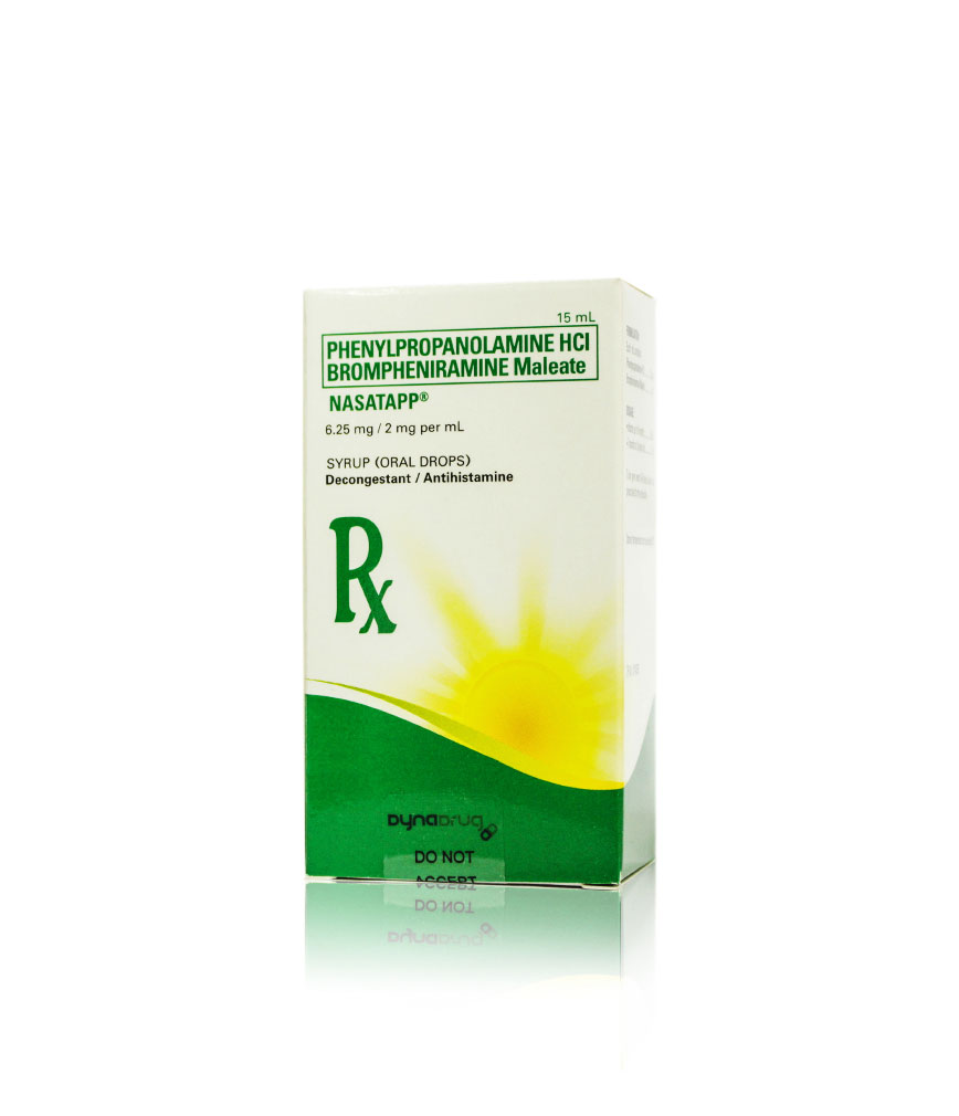 NASATAPP Oral Drops contains: Phenylpropanolamine Hydrochloride 6.25mg + Brompheniramine Maleate 2mg per 15mL bottle.