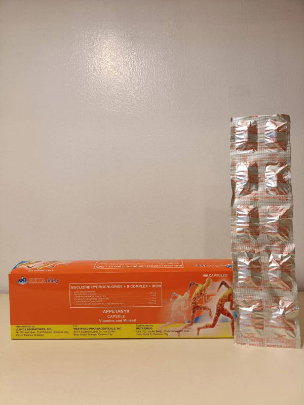 Pharmacist answers to questions about APPETANYX Buclizine Hydrochloride / Vitamin B Complex (Vit. B1, B6, & B12) / Iron 25mg / (10mg / 5mg / 10mg) / 76.06mg Capsule 100's