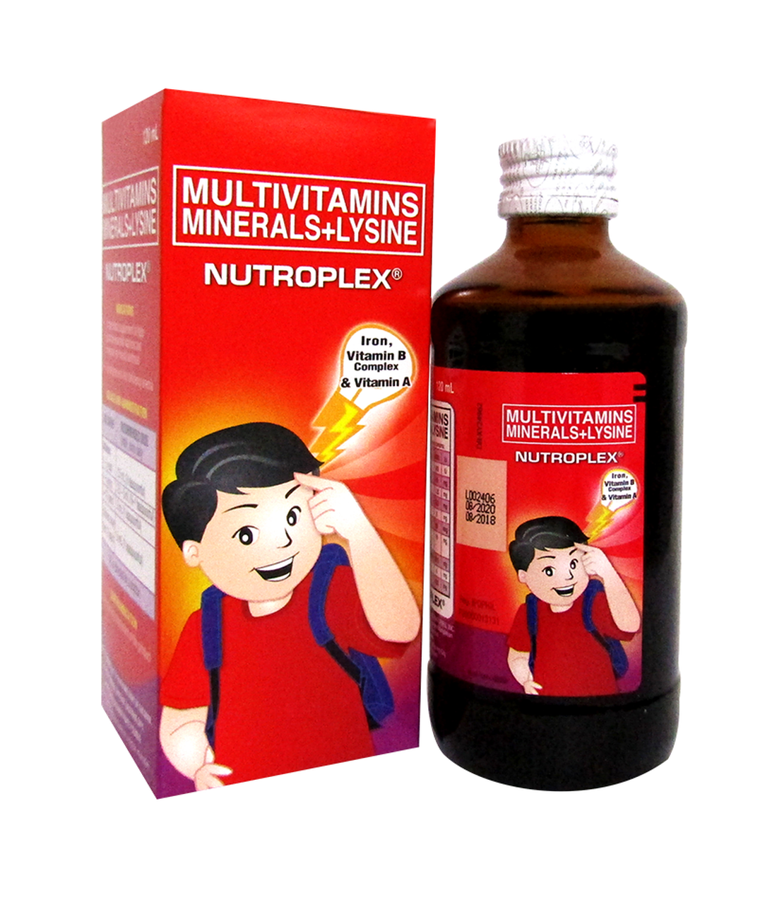 NUTROPLEX Multivitamins for Kids contains: Vitamin A 2,500 IU + Vitamin D 200 IU + Vitamin B1 10mg + Vitamin B2 1.25mg + Vitamin B3 12.5mg + Vitamin B6 5mg + Vitamin B12 50mcg + Iron (elemental) 15mg + Lysine Hydrochloride 100mg + Magnesium 4mg + Manganese 0.5mg